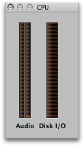 The window has two meters. The Audio meter shows the amount of CPU and RAM capacity used. On multi CPU/core computers, it will be subdivided to show performance for each CPU/core. The Disk I/O meter shows the amount of disk bandwidth used. Watch the meters as the song plays to get an idea of what area may be running short of resources.