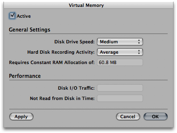 - Hard Disk Recording Activity: allows you to balance the performance of the EXS24 streaming with the demands that your audio tracks may place on Disk I/O. If you use very few audio tracks, set it to Less. If you typically work with a large number of audio tracks, Average or Extensive may be the better choice. Whether or not to enable Virtual Memory at all is another trade-off between RAM and hard drive performance. If most of your System Overloads seem to be accompanied by peaks in the Audio meter in System Performance, then enabling Virtual Memory may help, especially if you load lots of EXS24 samples in a typical project. If the Disk I/O meter is peaking, then turning off Virtual Memory may be the better choice. Settings in the Virtual Memory window are global—they affect all instances of the EXS24 in all songs.
