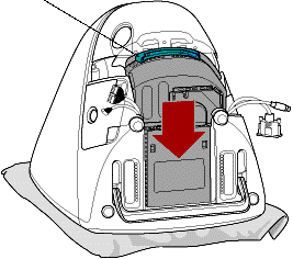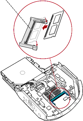 Figure 4 , Inserting the SO-DIMM. 21. With one hand on the plastic handle, gently lower the logic board/drive assembly straight down into the computer until it is in place. Use the plastic handle to lower the logic board straight down into the computer until it is seated.